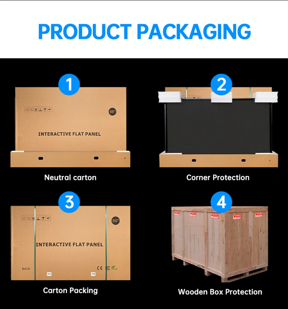 Den interaktiva displayen är säkert packad i en neutral kartong med förstärkt trälådskydd för säker transport.